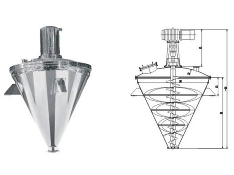 锥形螺带混合机由立式电机通过摆线针轮减速机直联主轴,主轴上有大下两圈螺带。启动混合机后,旋转的螺带将物料在混合室内沿壁面以自下而上的圆周移动而进行提升或抛起,当物料到达中心位置或最高点时,便靠自重向下运动,从而使物料在锥形混合室内相互扩散、对流、剪切、错位和掺混,迫使物料作全方位的空间不规则复合运动。占地面积小,结构简单,维护方便,可配备冷热夹层和喷液装置。